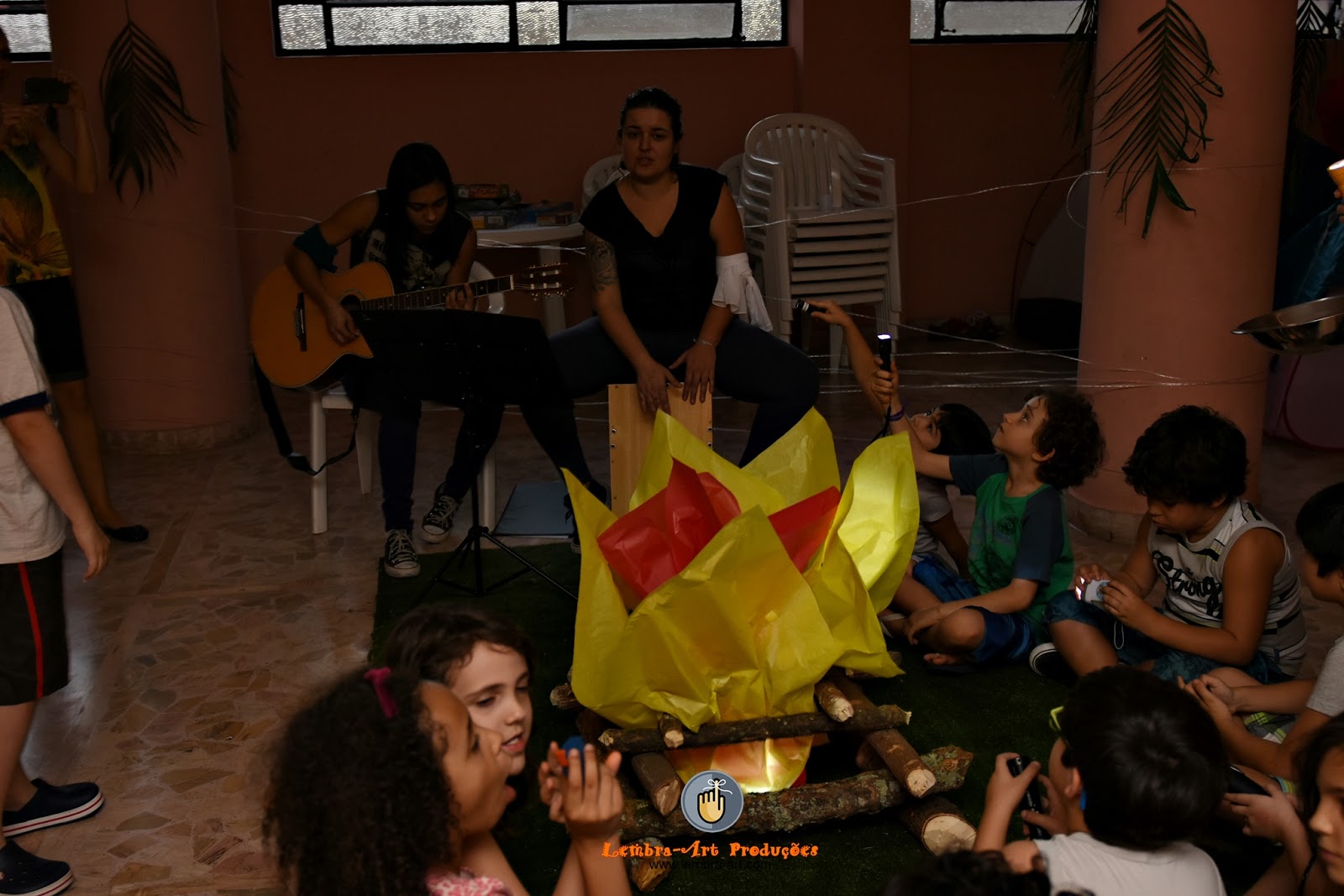 Música e brincadeiras a mil, até em torno da fogueira! Artificial, claro! rsrs